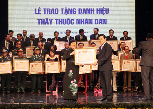 Nhân dịp này, Chủ tịch nước Trương Tấn Sang trao tặng danh hiệu Thầy thuốc nhân dân cho 67 cán bộ y tế, ghi nhận những cống hiến của đội ngũ thầy thuốc với sự nghiệp chăm sóc và bảo vệ sức khỏe nhân dân./.
