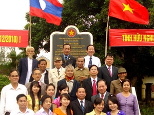 | Chụp ảnh lưu niệm tại Bia tưởng niệm Khu kháng chiến Hạ Lào và Phòng Biên chính Nam Trung Bộ tại huyện Phú Ninh, Quảng Nam. (Ảnh: Vietnam+) |