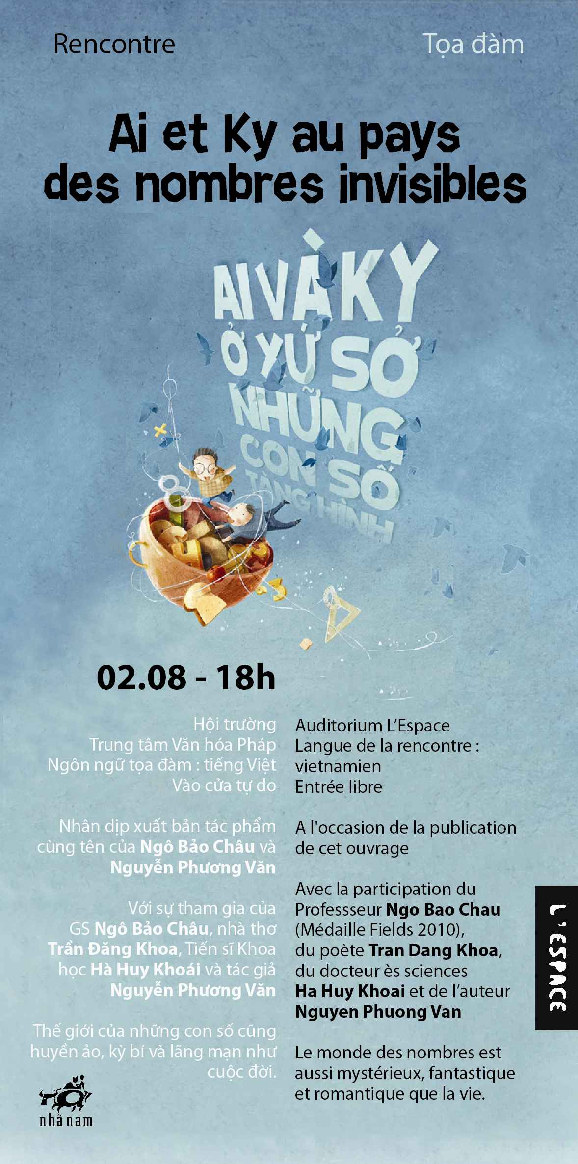 Vào lúc 18h ngày 2/8 tới đây, GS. Ngô Bảo Châu cũng sẽ có buổi nói chuyện về cuốn Ai và Ky ở xứ sở những con số tàng hình tại L'Espace, 24 Tràng Tiền, Hà Nội. Sự kiện do Công ty Văn hóa & Truyền thông Nhã Nam – đơn vị xuất bản cuốn sách và Trung tâm Văn hóa Pháp L'Espace phối hợp tổ chức.