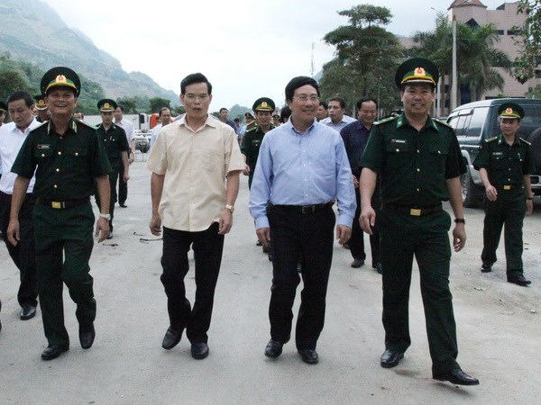 Phó Thủ tướng, Bộ trưởng Bộ Ngoại giao Phạm Bình Minh khảo sát tại Cửa khẩu Thanh Thủy, huyện Vị Xuyên, tỉnh Hà Giang. (Ảnh: Minh Tâm/TTXVN)