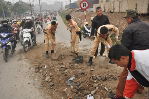 | Các chiến sĩ CSGT thu dọn đất đá để giải quyết ùn tắc - Ảnh: Tuổi trẻ |