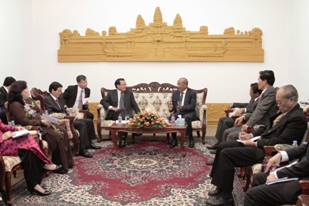 | Ông Phạm Quang Nghị (bên trái) hội đàm với ông Kep Chuktema |