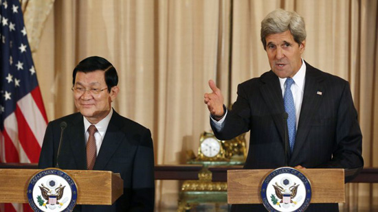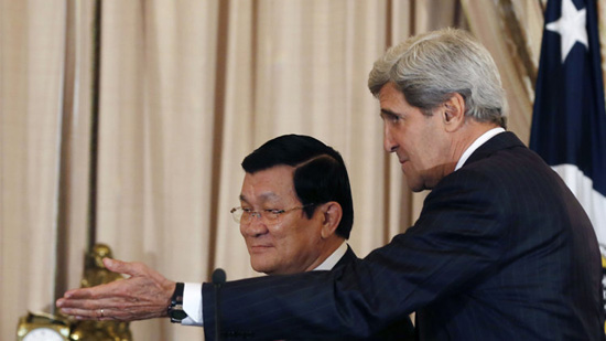 Còn dưới đây là hình ảnh Chủ tịch nước Trương Tấn Sang và Ngoại trưởng Mỹ John Kerry tại trụ sở Bộ Ngoại giao Mỹ vào ngày 24/7 (do Reuters chụp):