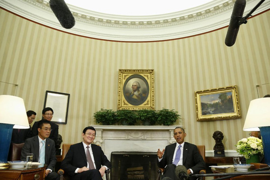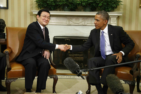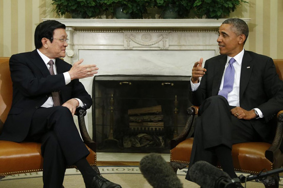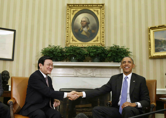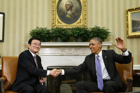 Dưới đây là hình ảnh Chủ tịch nước Trương Tấn Sang bên Tổng thống Obama tại Phòng Bầu dục, Nhà Trắng ngày 25/7 (giờ Washington) do AP ghi lại: