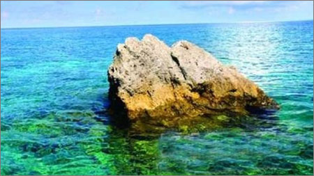 | Bãi đá Scarborough tranh chấp giữa Trung Quốc với Philippines. Khi triều lên chỉ có một mỏm đá màu vàng nhô lên |
