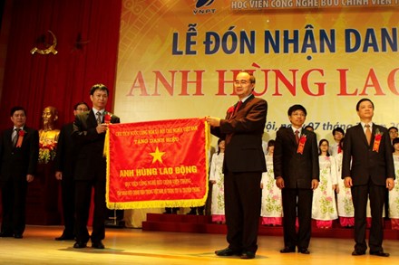 Phó Thủ tướng Nguyễn Thiện Nhân trao danh hiệu Anh hùng lao động cho Học viện CN BCVT. Ảnh: laodong.com.vn