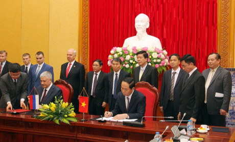 | Bộ trưởng Trần Đại Quang cùng Bộ trưởng Bộ Nội vụ Liên bang Nga Kolokoltsev Vladimir Aleksandrovich Ký kết Chương trình phối hợp hành động giữa hai Bộ giai đoạn 2016 – 2018 (Ảnh: cand.com.vn) |