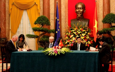 Tại hội đàm, hai bên bày tỏ hài lòng trước sự phát triển nhanh chóng và tích cực của quan hệ song phương trên cả ba trụ cột kinh tế - thương mại, chính trị và hợp tác phát triển trong thời gian qua. Chủ tịch nước Trương Tấn Sang và Chủ tịch Hội đồng Châu Âu Herman Van Rompuy nhất trí tiếp tục tăng cường tiếp xúc và trao đổi đoàn, nhất là đoàn cấp cao, tiếp tục khuyến khích và tạo điều kiện thuận lợi hơn nữa cho doanh nghiệp Việt Nam và EU đầu tư, kinh doanh lâu dài tại thị trường của nhau, đặc biệt trong các lĩnh vực công nghiệp, hạ tầng cơ sở, giao thông vận tải, năng lượng, tài chính, y tế, du lịch và dịch vụ. EU cam kết hỗ trợ kỹ thuật, thúc đẩy đàm phán để hai bên có thể sớm hoàn tất và ký kết Hiệp định FTA Việt Nam – EU; thúc đẩy việc sớm công nhận quy chế kinh tế thị trường của Việt Nam. Việt Nam đề nghị EU tiếp tục duy trì quy chế ưu đãi thuế quan phổ cập (GSP) đầy đủ cho Việt Nam trong giai đoạn 2013 – 2015 và ưu tiên thúc đẩy sớm thực hiện thỏa thuận công nhận lẫn nhau. Hai bên nhất trí phối hợp chặt chẽ nhằm triển khai hiệu quả các chương trình ODA giai đoạn 2011 - 2013 và xác định ưu tiên hợp tác trong giai đoạn 2014 – 2020 trên cơ sở Chiến lược phát triển kinh tế xã hội của Việt Nam giai đoạn 2011 – 2020, tập trung vào một số lĩnh vực quan trọng như giảm nghèo, phát triển bền vững, bảo vệ môi trường, ứng phó với biến đổi khí hậu.