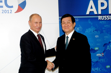 Tổng thống Nga Vladimir Putin đón Chủ tịch nước Trương Tấn Sang đến tham dự phiên họp kín APEC lần thứ 20. (Ảnh: Quang Hòa/TG&VN)