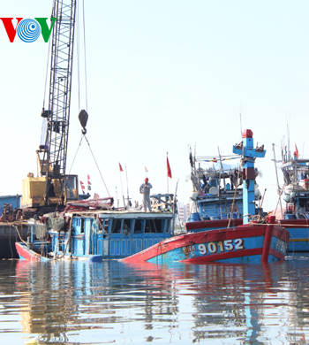 | Công nhân HTX đóng mới, sửa chữa trục vớt tàu thuyền Bắc Mỹ An đang dùng xà lan, cần cẩu trục vớt con tàu đưa lên đà để sửa chữa. |