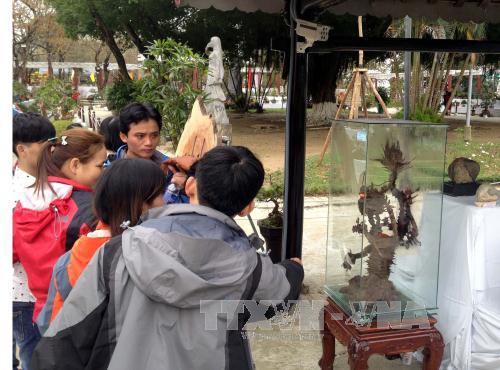 | Khu trưng bày bonsai, non bộ, tiểu cảnh, đá nghệ thuật, mai vàng luôn thu hút khách khi đến với Hội vui Xuân Bính Thân bên bờ sông Hương (Ảnh: TTXVN) |