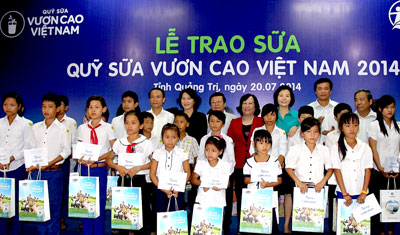 Hơn 72.000 ly sữa được trao cho 800 em học sinh, con em gia đình thương binh liệt sĩ, có công với cách mạng, con em của các chiến sĩ hải quân và ngư dân có cuộc sống khó khăn. Năm 2014, Quỹ sữa “Vươn cao Việt Nam” trao hàng trăm ngàn ly sữa cho con em gia đình khó khăn với tổng trị giá 8 tỷ đồng. Toàn bộ số sữa này được Quỹ Bảo trợ trẻ em Việt Nam cùng Vinamilk chuyển đến các trung tâm nuôi dưỡng trẻ mồ côi, khuyết tật, trung tâm bảo trợ xã hội, các em học sinh mầm non, tiểu học vùng sâu, vùng xa ở 63 tỉnh thành trong cả nước./.