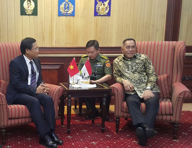 | Đại sứ Việt Nam tại Indonesia Hoàng Anh Tuấn chào xã giao với Bộ trưởng Quốc phòng nước Cộng hòa Indonesia Ryamizard Ryacudu. |