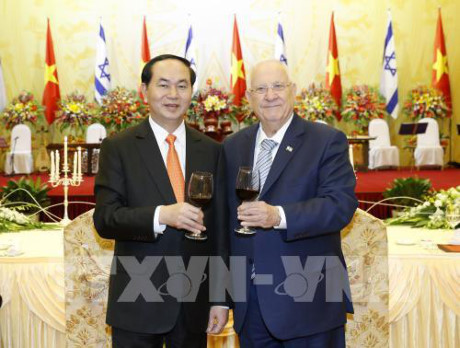Tối 20/3, tại Hà Nội, Chủ tịch nước Trần Đại Quang và phu nhân đã chủ trì tiệc chiêu đãi trọng thể chào mừng Tổng thống Israel Reuven Ruvi Rivlin và phu nhân, cùng đoàn đại biểu, đang có chuyến thăm cấp nhà nước tới Việt Nam. Phát biểu tại tiệc chiêu đãi, Chủ tịch nước Trần Đại Quang khẳng định Việt Nam luôn coi trọng quan hệ với Israel, một trong những đối tác quan trọng của Việt Nam tại khu vực Trung Đông. Chủ tịch nước nhấn mạnh tinh thần của một “Quốc gia khởi nghiệp”, ý chí của một dân tộc đã và đang “bắt sa mạc nở hoa” thực sự là nguồn cảm hứng mạnh mẽ, thúc đẩy tinh thần sáng tạo, đương đầu với thử thách, dám nghĩ dám làm cho thế hệ trẻ Việt Nam trong công cuộc công nghiệp hóa, hiện đại hóa đất nước. Chủ tịch nước Trần Đại Quang tin rằng, hợp tác song phương Việt Nam – Israel sẽ bước vào một giai đoạn phát triển mới, hiệu quả, vì lợi ích của nhân dân hai nước. Về phần mình, Tổng thống Reuven Ruvi Rivlin cho biết Israel sẵn sàng cùng chia sẻ, trao đổi kiến thức và kinh nghiệm trong những lĩnh vực Israel có thế mạnh, đáp ứng nhu cầu trong các lĩnh vực Việt Nam đang quan tâm, qua đó thúc đẩy hợp tác, phát triển quan hệ song phương trong tương lai.
