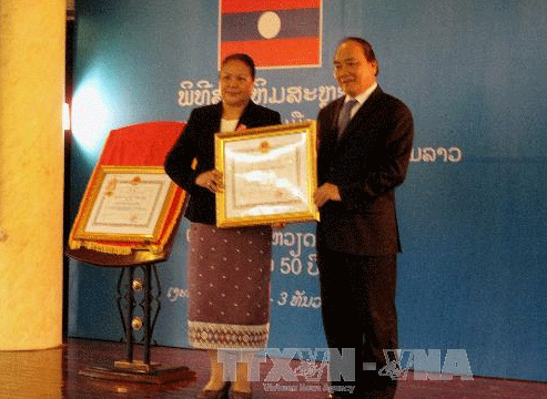 Phó Thủ tướng Nguyễn Xuân Phúc trao Huân chương Độc lập hạng Nhất của Chủ tịch nước CHXHCN Việt Nam tặng Bộ Lao động và Phúc lợi xã hội Lào, cho Bộ trưởng Bộ Lao động và Phúc lợi xã hội Lào, Onechanh Thammavong Ảnh: TTXVN