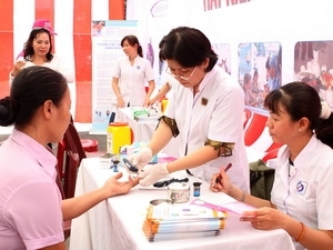 | Bác sỹ kiểm tra đường huyết cho người dân. (Ảnh: TTXVN) |