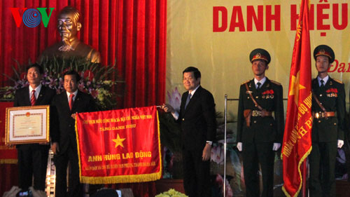 (VOV5) - Chiều nay (19/10), Đảng bộ, chính quyền và nhân dân huyện Đan Phương, thành phố Hà Nội đã long trọng tổ chức Lễ đón nhận danh hiệu Anh hùng Lao động, phần thưởng cao quý của Đảng và Nhà nước trao tặng. Tới dự có Chủ tịch nước Trương Tấn Sang; Ủy viên Bộ Chính trị, Bí thư Thành ủy Hà Nội Phạm Quang Nghị; đại diện lãnh đạo các ban ngành Trung ương và thành phố Hà Nội, cùng đông đảo bà con địa phương.