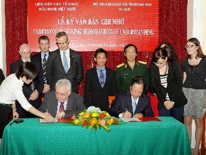 (VOV5)- Nhân chuyến thăm làm việc tại Việt Nam từ ngày 28 đến 31/10/2012, ngày 29/10, tại Hà Nội, Bộ trưởng phụ trách thương mại và phát triển Ireland Joe Costello và Chủ tịch Liên hiệp các tổ chức hữu nghị Việt Nam Vũ Xuân Hồng đã ký biên bản ghi nhớ về hỗ trợ rà phá bom mìn.