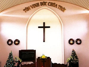 | Đạo Tin lành không thờ tranh ảnh, hình tượng cũng như di vật, ở khu vực cung thánh chỉ có một cây thánh giá to. (Nguồn: btgcp.gov) |