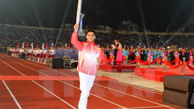 Ngọn đuốc của Đại hội được vận động viên Dương Văn Thái (Nam Định) rước trong lễ khai mạc. (Ảnh: Quốc Khánh/TTXVN)