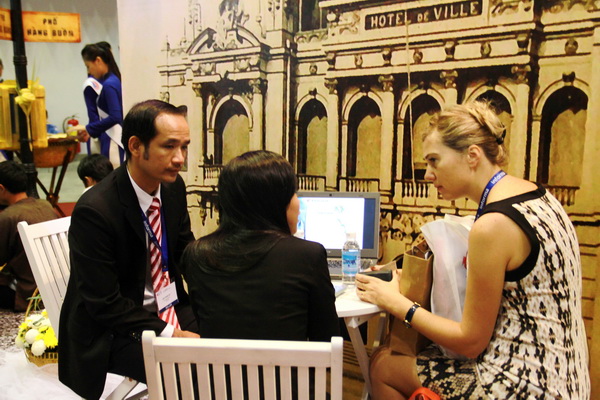 Du khách tham khảo tour tại một gian hàng trong hội chợ. Ảnh: Thiên Nam