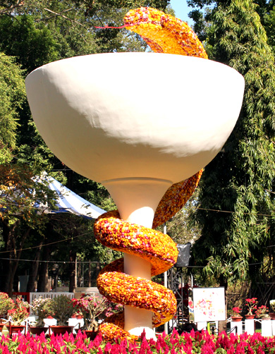 Ngay giữa công viên là một con rắn lớn (con giáp của Tết năm nay) bằng hoa bất tử uốn quanh chiếc ly.