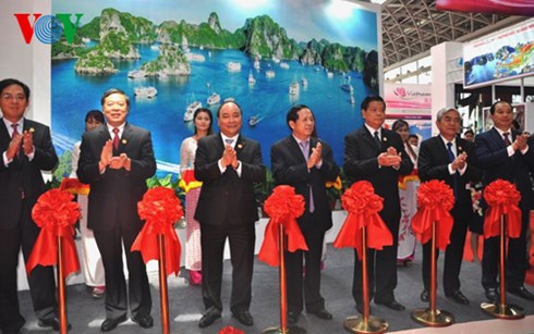 | Phó Thủ tướng Nguyễn Xuân Phúc và lãnh đạo các bộ, ngành cắt băng khai trương gian hàng Việt Nam |