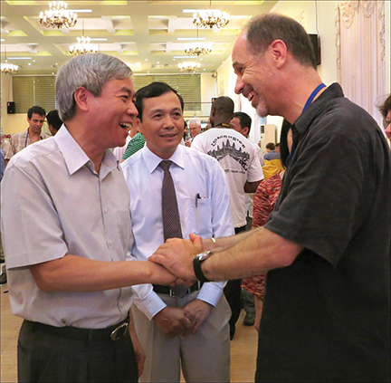 | Chủ tịch UBND thành phố Dương Anh Điền chào đón Chủ tịch Hiệp hội Khoa học hệ thống thế giới Alexander Laszlo (Ảnh: Báo Hải phòng) |
