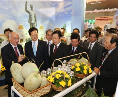 | Thủ tướng Nguyễn Tấn Dũng thăm gian hàng của TP.HCM tại triển lãm 70 năm Thành tựu kinh tế - xã hội 2015 -Ảnh: Việt Dũng |