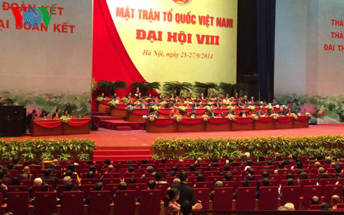 (VOV5) - Lễ khai mạc Đại hội Mặt trận Tổ quốc (MTTQ) Việt Nam lần thứ VIII diễn ra trọng thể sáng nay, 26/9, tại Trung tâm Hội nghị quốc gia Mỹ Đình, Hà Nội. Tổng Bí thư Ban chấp hành Trung ương Đảng cộng sản Việt Nam Nguyễn Phú Trọng, Chủ tịch nước Trương Tấn Sang, Chủ tịch Quốc hội Nguyễn Sinh Hùng, Thủ tướng Chính phủ Nguyễn Tấn Dũng cùng nhiều vị lãnh đạo, nguyên là lãnh đạo Đảng, Nhà nước, Chính phủ, Quốc hội, các đoàn thể, đoàn ngoại giao tại Hà Nội và hơn 1 nghìn đại biểu là các nhân sỹ trí thức, đại diện các tầng lớp nhân dân, các lực lượng vũ trang, các đoàn thể, các tôn giáo, các Mẹ Việt Nam anh hùng, các đoàn ngoại giao tại Hà Nội, người Việt Nam ở nước ngoài tham dự Đại hội.