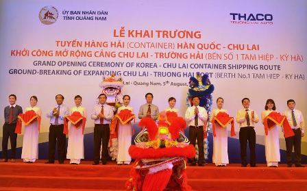 | Lãnh đạo tỉnh cắt băng khai trương tuyến hàng hải (container) Hàn Quốc - Chu Lai và khởi công mở rộng cảng Chu Lai - Trường Hải. Ảnh: V.D |