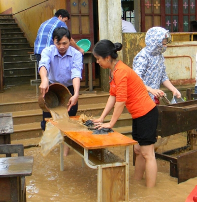Các thầy giáo,cô giáo Trường tiểu học Liên Sơn,xã Mai Hóa huyện Tuyên Hóa(Quảng Bình) lau rửa bàn ghế để học sinh sớm trở lại trường.