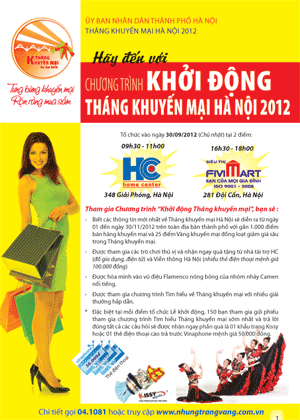 (VOV5) - Ủy ban nhân dân thành phố Hà Nội ngày 30/9 khởi động Tháng Khuyến mại Hà Nội 2012. Sẽ có 1000 điểm khuyến mại. Hội chợ vàng khuyến mại tổ chức tại hội chợ triển lãm Giảng Võ từ ngày 2 - 6/11. Đặc biệt, Tuần bán hàng khuyến mại trực tuyến trên website “shoptrangvang.vn” sẽ được tổ chức trong các ngày từ ngày 7 - 15/11. Ngoài ra, Tháng khuyến mại có 8 ngày vàng khuyến mãi tại 25 điểm khuyến mãi vàng vào các ngày thứ Bảy, Chủ nhật của tháng 11.