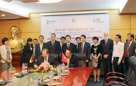 Đại diện Bộ Tài nguyên và Môi trường và Quỹ Hanns-Seidel (HSF - Đức) ký kết thỏa thuận hợp tác. Ảnh: QDND