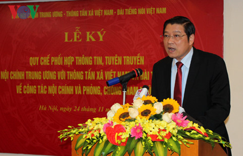 Chiều 24/11, tại Hà Nội, diễn ra lễ ký kết quy chế phối hợp thông tin, tuyền truyền giữa Ban Nội chính Trung ương với Đài Tiếng nói Việt Nam và Thông tấn xã Việt Nam. Theo đó, Quy chế phối hợp giữa Ban Nội chính Trung ương với Đài Tiếng nói Việt Nam và Thông tấn xã Việt Nam sẽ cùng nhau thông tin, tuyên truyền đường lối, chủ trương, các quy định của Đảng, chính sách, pháp luật của Nhà nước về lĩnh vực nội chính và phòng chống tham nhũng. Phát biểu tại buổi lễ, Trưởng Ban Nội chính Trung ương Phan Đình Trạc nhấn mạnh: “Ban Nội Chính Trung ương luôn nhận được sự quan tâm phối hợp có hiệu quả của Thông tấn xã Việt Nam và Đài Tiếng nói Việt Nam trong công tác Nội chính, phòng, chống tham nhũng, nhất là các cuộc họp của Thường trực Ban chỉ đạo, hoạt động kiểm tra giám sát, đôn đốc công tác phòng chống tham nhũng của Ban Chỉ đạo. Phối hợp thông tin kịp thời, đúng quy định pháp luật về chủ trương, kết quả xử lý các vụ việc, vụ án tham nhũng nghiêm trọng, phức tạp dư luận quan tâm”.