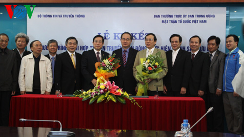 | Đại diện Ủy ban TW MTTQ Việt Nam và Bộ Thông tin truyền thông chụp hình lưu niệm sau Lễ ký kết chương trình phối hợp. |