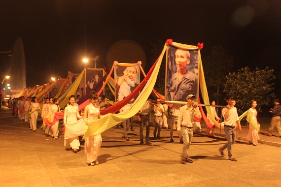 123 học sinh mang ảnh chân dung Bác diễu hành từ nhà tưởng niệm đến sân vận động Làng Sen