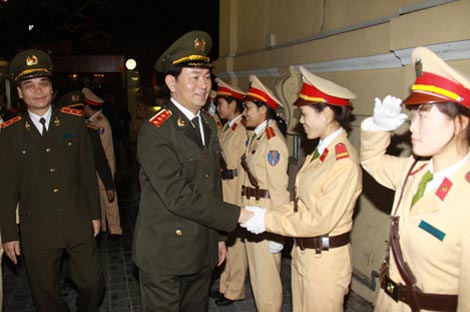 | Thượng tướng Trần Đại Quang, Ủy viên Bộ Chính trị, Bộ trưởng Bộ Công an kiểm tra công tác đảm bảo an ninh, trật tự tại Phòng Cảnh sát Giao thông, Công an TP Hà Nội, tháng 1/2012 (Ảnh: Công an nhân dân) |