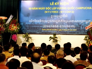 (VOV5) - Ngày 9/11, Liên hiệp các tổ chức hữu nghị Thành phố Hồ Chí Minh và Hội hữu nghị Việt Nam – Campuchia Thành phố Hồ Chí Minh tổ chức lễ kỷ niệm lần thứ 59 Ngày Độc lập Vương quốc Campuchia (9/11/1953- 9/11/2012).