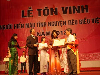 Bộ trưởng Bộ Y tế Nguyễn Thị Kim Tiến trao tặng Bằng khen tại Lễ tôn vinh những người hiến máu tình nguyện tiêu biểu năm 2012