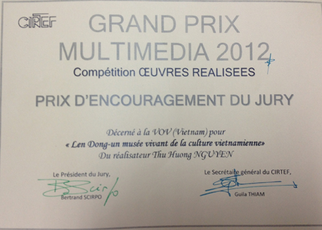(VOV5) - Hội đồng quốc tế các đài phát thanh truyền hình Pháp ngữ (CIRTEF) vừa trao giải khuyến khích cuộc thi Giải thưởng lớn đa phương tiện 2012 (Grand Prix Multimedia 2012) cho phóng sự "Lên đồng - bảo tàng sống của văn hoá Việt Nam" của tác giả Nguyễn Thu Hương, thuộc Hệ Phát thanh đối ngoại-VOV5.