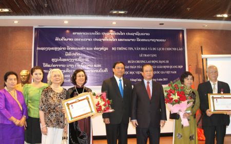 (VOV5) - Bộ Thông tin, Văn hóa và Du lịch Lào tổ chức lễ trao tặng Huân chương Lao động hạng Ba của Nhà nước Lào cho cô giáo Trần Tô Lan và thầy giáo Đinh Quang Hợp.
