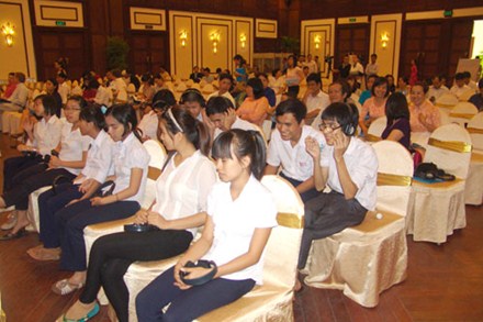 Học sinh Trường khiếm thị Nguyễn Đình Chiểu (Đà Nẵng) và các em là nạn nhân chất độc da cam dự Lễ công bố. Ảnh: Trung Hiếu