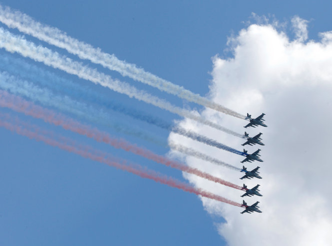 | Sáu máy bay chiến đấu Su-25 bay theo đội hình, tạo khói với màu sắc của quốc kỳ Nga trên bầu trời ở khu vực Quảng trường Đỏ - Ảnh: Reuters |