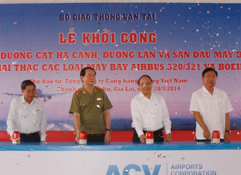 | Phó Thủ tướng Chính phủ Nguyễn Xuân Phúc; Bộ trưởng Bộ Công an Trần Đại Quang và các đại biểu nhấn nút phát lệnh động thổ dự án nâng cấp mở rộng Cảng hàng không Pleiku (Ảnh: cand.com) |