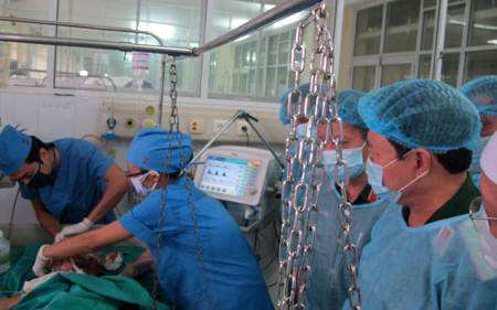 | Thượng tướng Ngô Xuân Lịch thăm các đồng chí bị thương đang điều trị tại viện bỏng (Ảnh: Quân đội Nhân dân) |