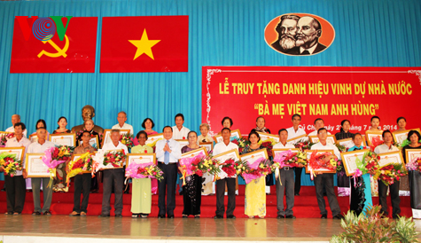(VOV5) - Sáng nay, Thành ủy, Ủy ban nhân dân, Ủy ban Mặt trận Tổ quốc Việt Nam thành phố Hồ Chí Minh long trọng tổ chức Lễ truy tặng danh hiệu vinh dự Nhà nước “Bà mẹ Việt Nam anh hùng” cho 831 bà mẹ. Đây là các mẹ có nhiều người thân hy sinh cho sự nghiệp giải phóng dân tộc, xây dựng và bảo vệ tổ quốc.