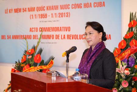 Phát biểu tại buổi lễ, bà Nguyễn Thị Kim Ngân, Phó Chủ tịch Quốc hội, Chủ tịch Hội Hữu nghị Việt Nam-Cuba, bày tỏ tin tưởng với bản lĩnh và ý chí kiên cường, nhân dân Cuba sẽ tiếp tục vượt qua mọi khó khăn, thử thách, triển khai thực hiện thắng lợi nghị quyết Đại hội VI Đảng Cộng sản Cuba về cập nhật hóa mô hình kinh tế, giữ vững và phát huy những thành quả đã đạt được trên nhiều lĩnh vực kinh tế-xã hội. Bà Nguyễn Thị Kim Ngân mong chính quyền Mỹ nhanh chóng gỡ bỏ bao vây cấm vận chống Cuba trong nửa thế kỷ qua./.