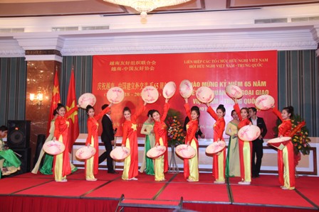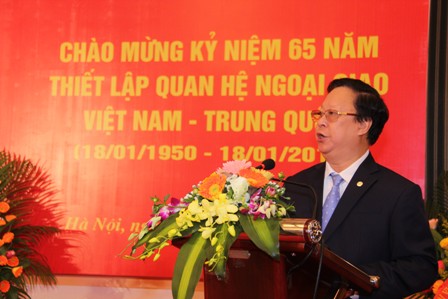 Phát biểu khai mạc lễ kỷ niệm, Chủ tịch Liên hiệp các tổ chức hữu nghị Việt Nam Vũ Xuân Hồng nhấn mạnh ý nghĩa quan trọng và những thành tựu trong quan hệ hai nước trong chặng đường 65 năm qua, khẳng định tình hữu nghị Việt – Trung là tài sản quý báu của nhân dân hai nước, đòi hỏi hai Đảng, hai Nhà nước phải trân trọng giữ gìn. Việc tăng cường giao lưu, hiểu biết và tin cậy lẫn nhau là nhân tố quan trọng cho quan hệ Việt-Trung phát triển lành mạnh: Tăng cường các hoạt động giao lưu hữu nghị để cùng nhau chia sẻ lòng chân thành, sự thông cảm, vun đắp niềm tin, tăng cường đồng thuận và không ngừng làm nảy nở những điều tốt đẹp, rút ngắn những khoảng cách và bất đồng. Chúng ta hãy cùng nhau nghiên cứu và đề xuất những hình thức hợp tác cùng có lợi, đem lại lợi ích thiết thực cho nhân dân hai nước, góp phần thực hiện hiệu quả chương trình hành động triển khai quan hệ hợp tác đối tác chiến lược Việt-Trung.