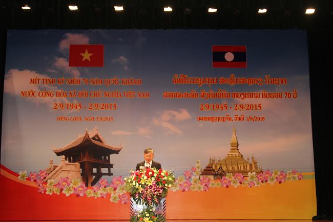 Trong bài phát biểu của mình, Đại sứ Việt Nam tại Lào Nguyễn Mạnh Hùng bày tỏ sự xúc động và tự hào được dự Lễ mít tinh kỷ niệm 70 năm Quốc khánh Việt Nam tổ chức tại thủ đô Viêng Chăn. Ôn lại truyến thống đấu tranh anh dũng của nhân dân Việt nam trong công cuộc đấu tranh giải phóng dân tộc và tự hào trước những thành tựu mà toàn Đảng, toàn quân, toàn dân Việt Nam giành được trong sự nghiệp xây dựng và phát triển đất nước trong những năm qua. Đại sứ Nguyễn Mạnh Hùng nhấn mạnh: “Trong mỗi thắng lợi và thành tựu mà nhân dân Việt Nam giành được trong suốt 70 năm qua đều có sự ủng hộ, giúp đỡ quý báu của bạn bè quốc tế, đặc biệt là tình đoàn kết và sự giúp đỡ to lớn, chí tình, chí nghĩa của Đảng, nhà nước và nhân dân Lào anh em. Nhân dịp kỷ niệm ngày lễ trọng đại này, thay mặt Đảng, nhà nước và nhân dân Việt Nam, một lần nữa, tôi xin bày tỏ long biết ơn Đảng, nhà nước và nhân dân lào anh em luôn đoàn kết ủng hộ và giúp đỡ Việt Nam”.